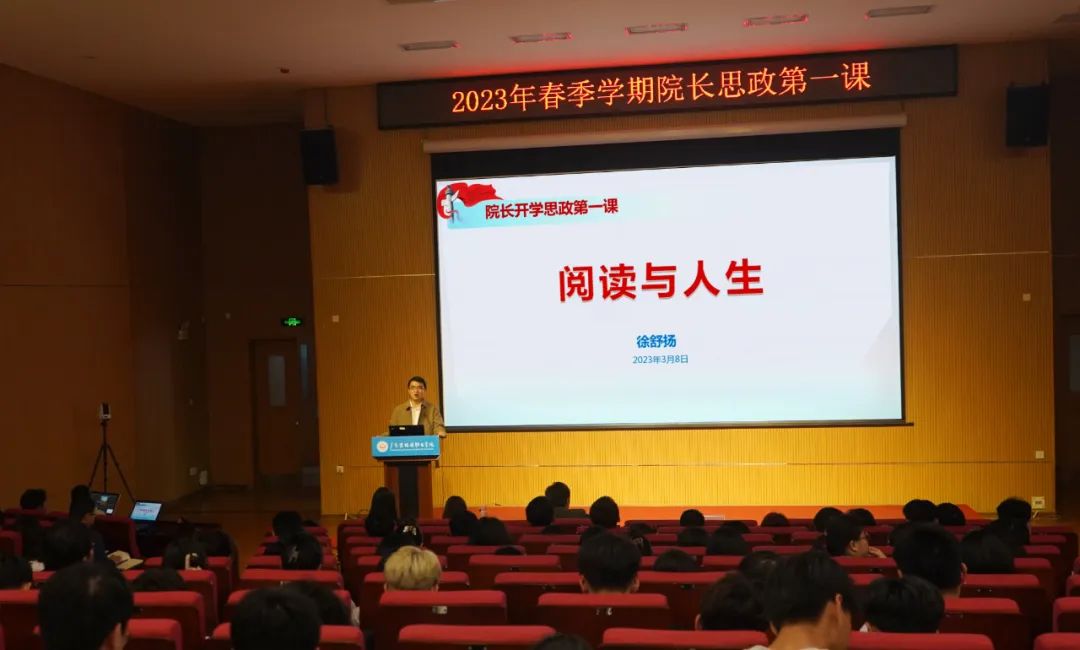 3月8日下午,学校执行校长徐舒扬在学术报告厅讲授题为《阅读与人生》的第一堂思政课,学生工作处工作人员,全体辅导员,学生代表共计200多人参加,此外,近700人次通过视频直播的方式一起聆听。本堂思政课由学校副校长李颂国主持。