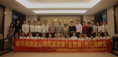 2017年5月9日,学院董事会校监梁炽娟,院长刘惠坚,党委书记、副院长许从进,副院长苏成柏,教务科研处、校企合作处、物业管理专业教学部负责人等一行前往碧桂园物业总公司观摩物业管理专业2014级学生凤凰管家(主管级)竞聘会。碧桂园物业公司总经理李长江、副总经理夏晓楠等企业领导热情接待。