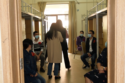 演练的第二个环节,在学生宿舍晨检时,发现某间宿舍同学体温异常,负责晨检的老师立即联系辅导员将该名同学送至校医室并安抚同寝室学生,辅导员了解情况后立即与家长联系,校医将其安置在临时隔离室,并上报相关卫生部门。